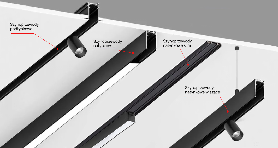Sposób instalacji szynoprzewodu, w którym szyna jest ukryta w suficie (podtynkowo) lub widoczna i montowana bezpośrednio na jego powierzchni (natynkowo). Wybór zależy od rodzaju sufitu, etapu prac wykończeniowych oraz efektu wizualnego, jaki chcesz uzyskać.